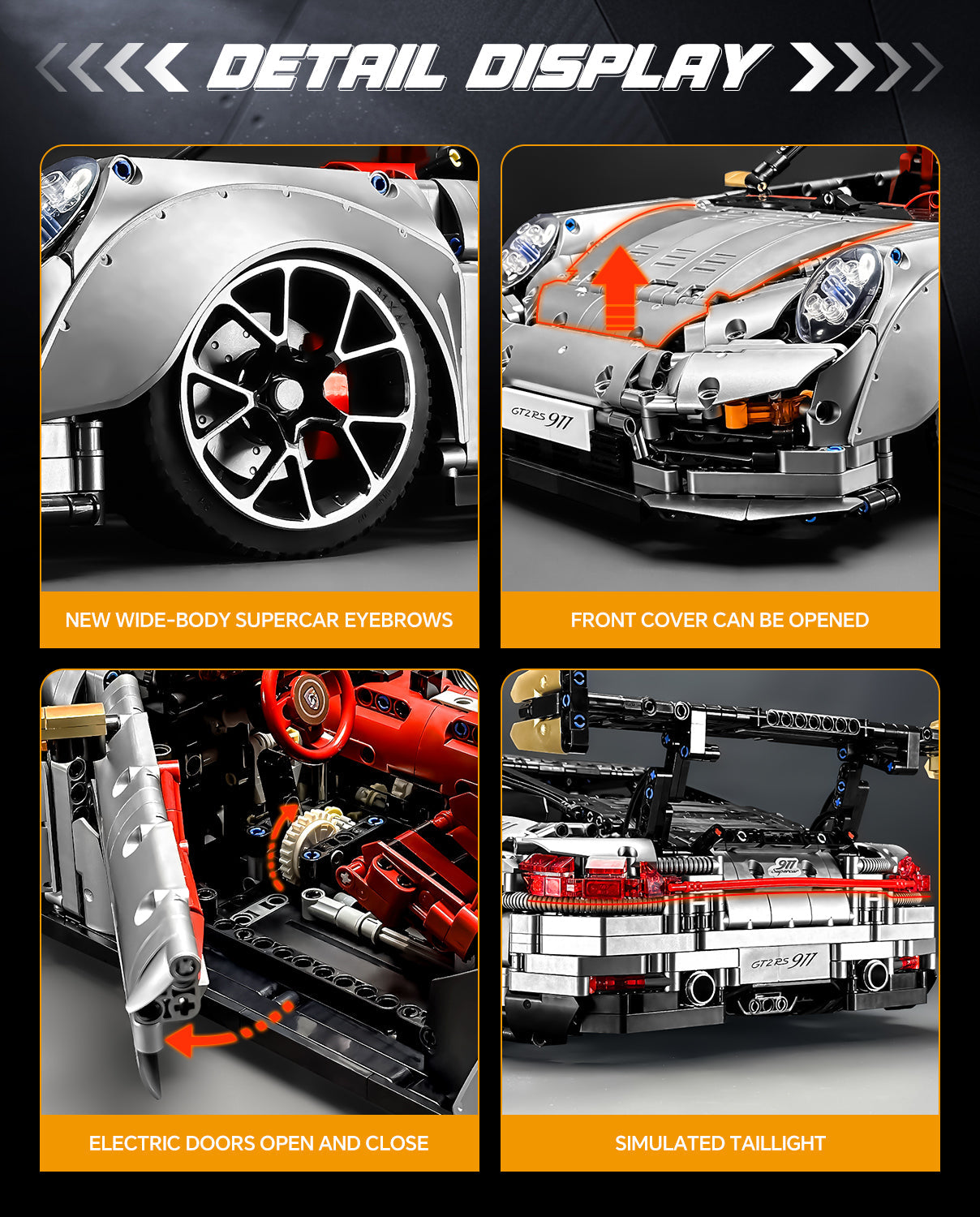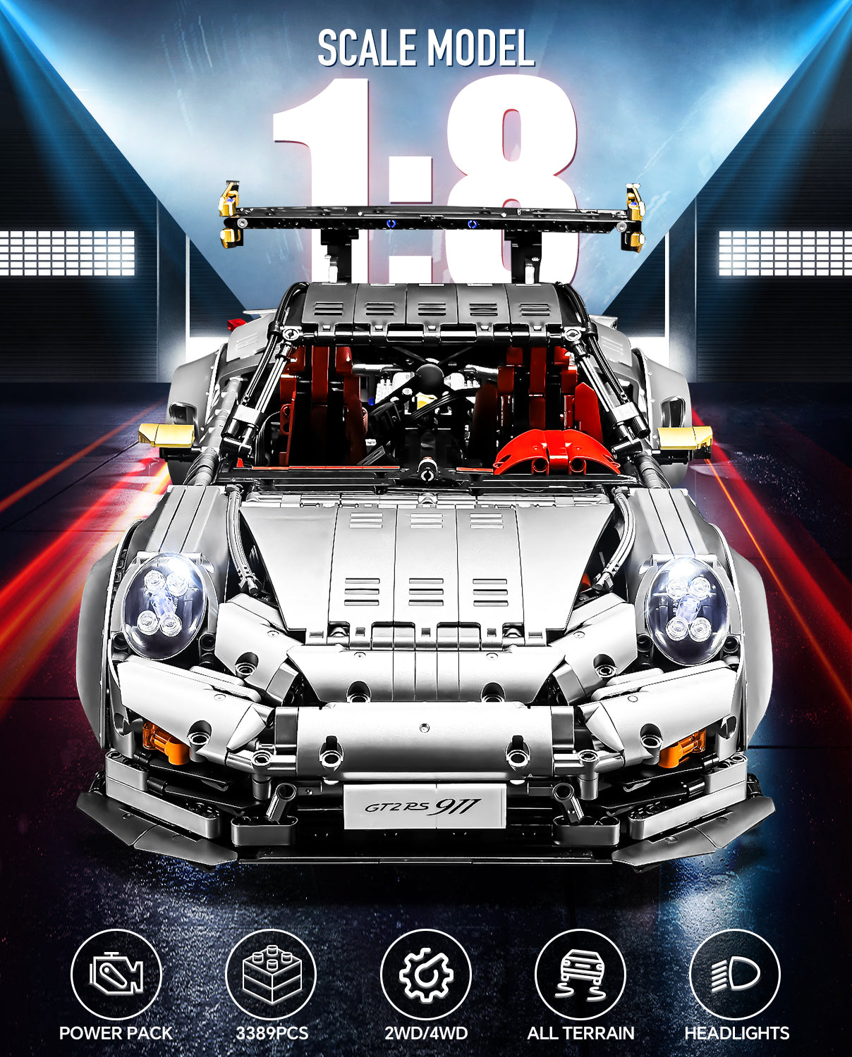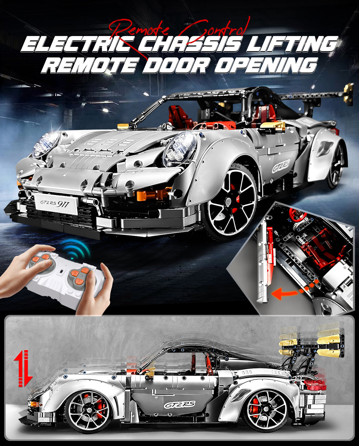 1:8 Sliver Porsche GT2 RS with Electric Suspension Lifting, Electric Doors Remote Control Model (3389 Pcs)